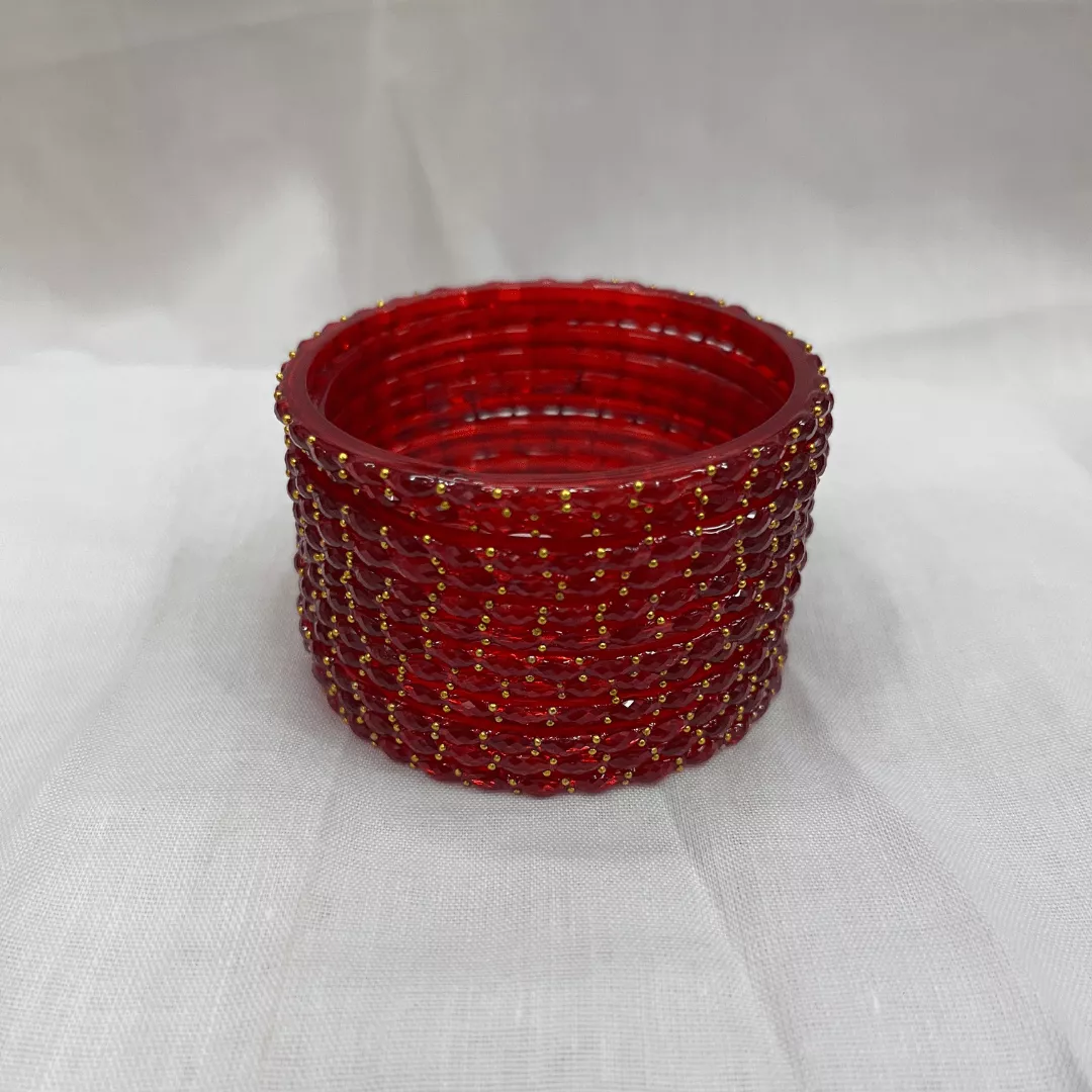 Celebrate tradition with a modern twist through this stunning set of Jal glass bangles, beautifully handcrafted to elevate your festive style. Featuring a glossy enamel finish and delicately embellished with golden bead accents, each bangle shines with its own unique charm.