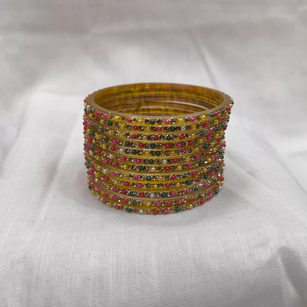 This set of 12 bangles beautifully blends traditional charm with a stylish twist. Whether you’re styling a lehenga, saree, or salwar suit, these bangles add just the right amount of sparkle to elevate your look. The intricate stone-studded design reflects exceptional craftsmanship and attention to detail, ensuring that you wear not just bangles, but a piece of art.