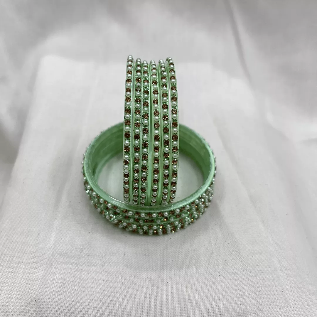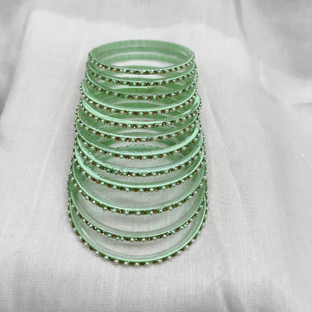 Add a pop of elegance to your ethnic ensemble with this exquisite set of Pista handcrafted glass bangles. Designed to shine, each bangle is made from premium-quality glass and meticulously embellished with sparkling stones that glimmer with every move. The cool, refreshing sky blue hue offers a graceful contrast to rich festive outfits, making it an ideal accessory for weddings, parties, and cultural celebrations.