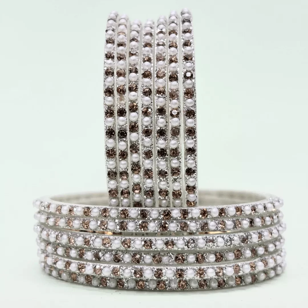 Add a pop of elegance to your ethnic ensemble with this exquisite set of silver handcrafted glass bangles. Designed to shine, each bangle is made from premium-quality glass and meticulously embellished with sparkling stones that glimmer with every move. The cool, refreshing sky blue hue offers a graceful contrast to rich festive outfits, making it an ideal accessory for weddings, parties, and cultural celebrations.
