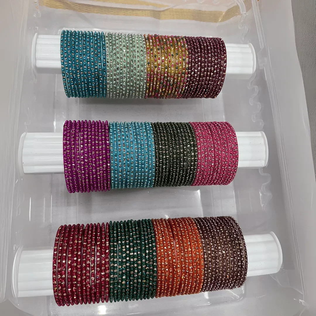 This set of 12 bangles beautifully blends traditional charm with a stylish twist. Whether you’re styling a lehenga, saree, or salwar suit, these bangles add just the right amount of sparkle to elevate your look. The intricate stone-studded design reflects exceptional craftsmanship and attention to detail, ensuring that you wear not just bangles, but a piece of art.