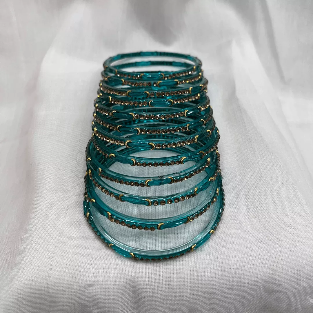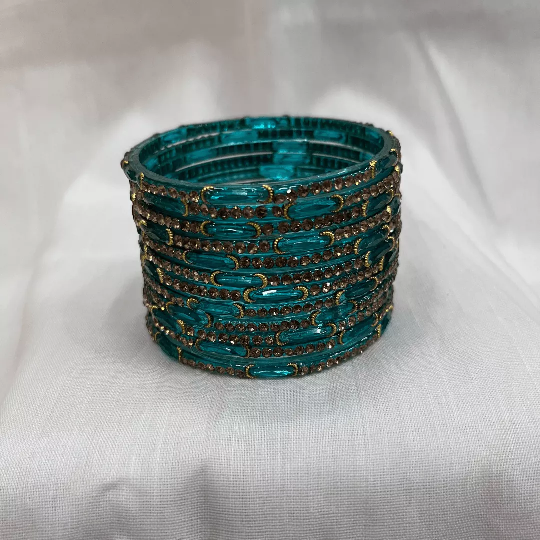 Elevate your traditional style with this exquisite set of handcrafted Radium glass bangles, thoughtfully designed to reflect antique elegance and timeless beauty. This 12-piece set features a captivating dual-tone palette—rich Radium glass beautifully accented with subtle purple-brown hues. The design intricately blends long, rectangular glass stones with delicate round embellishments, creating a textured and luxurious look that catches the eye.