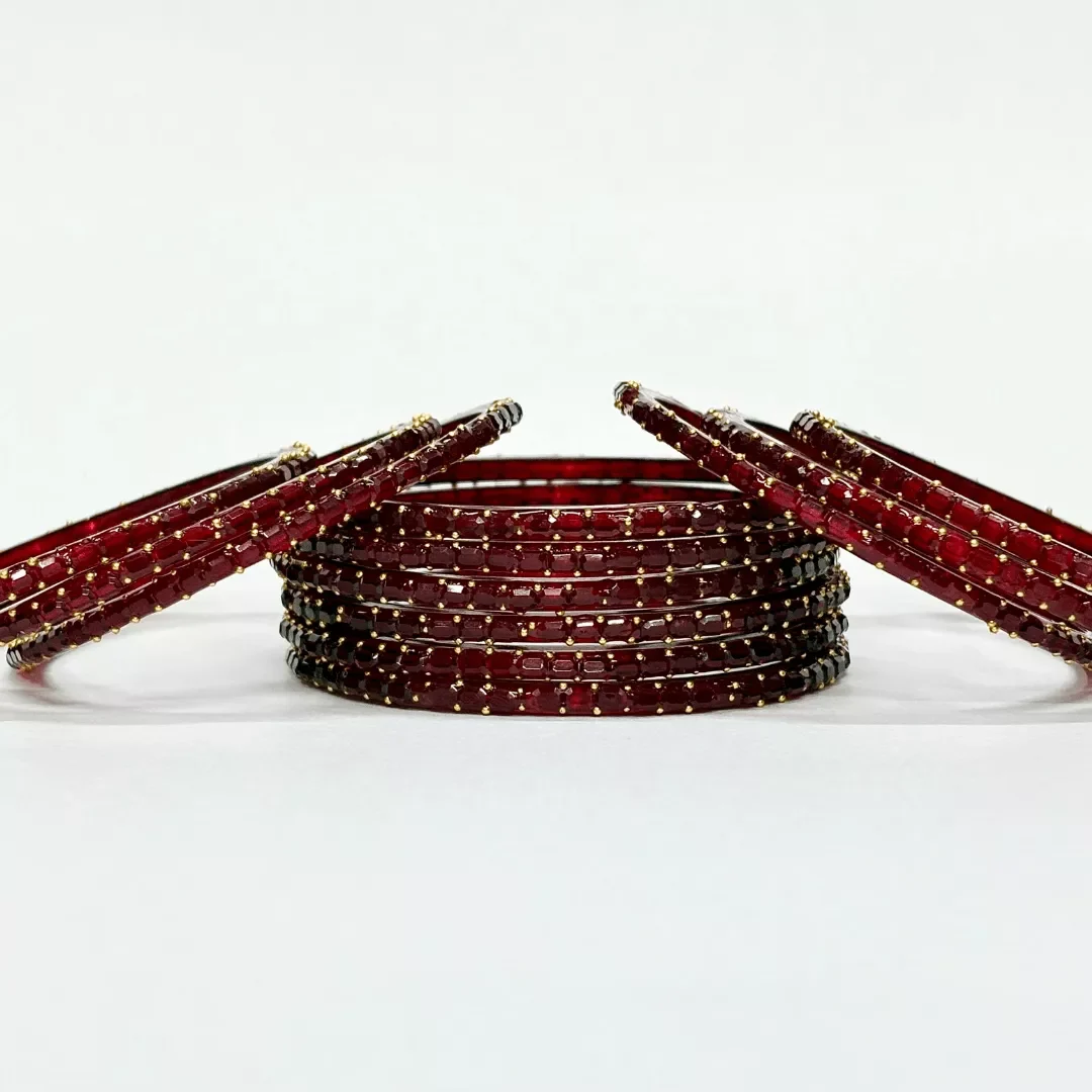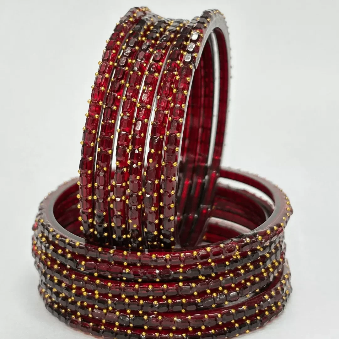 Add a vibrant touch to your ethnic and festive look with this stunning set of marron glass bangles. Crafted from premium-quality transparent glass, each bangle features a beautiful blend of bright hues including pink, yellow, green, and blue, highlighted with delicate golden bead detailing for an elegant finish.