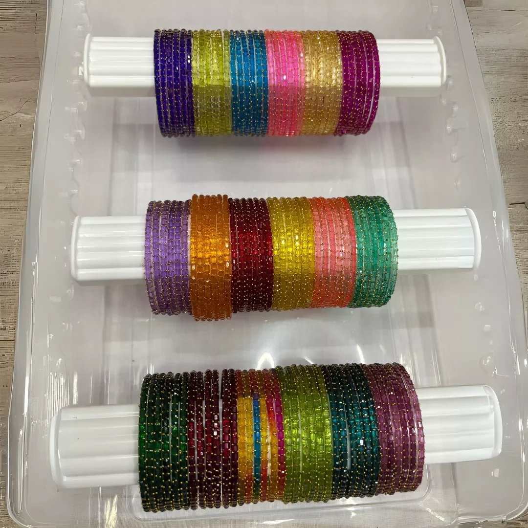 Add a vibrant touch to your ethnic and festive look with this stunning set of multi glass bangles. Crafted from premium-quality transparent glass, each bangle features a beautiful blend of bright hues including pink, yellow, green, and blue, highlighted with delicate golden bead detailing for an elegant finish.