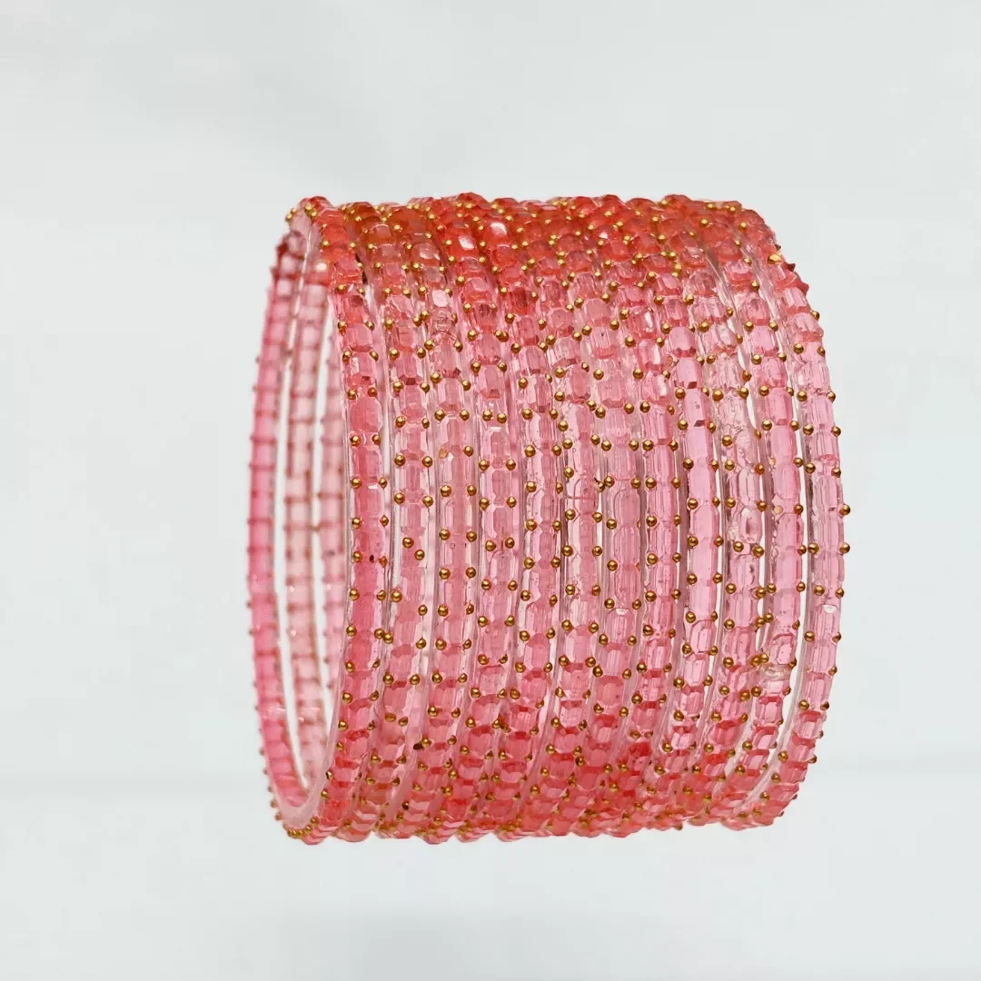 Add a vibrant touch to your ethnic and festive look with this stunning set of pich glass bangles. Crafted from premium-quality transparent glass, each bangle features a beautiful blend of bright hues including pink, yellow, green, and blue, highlighted with delicate golden bead detailing for an elegant finish.