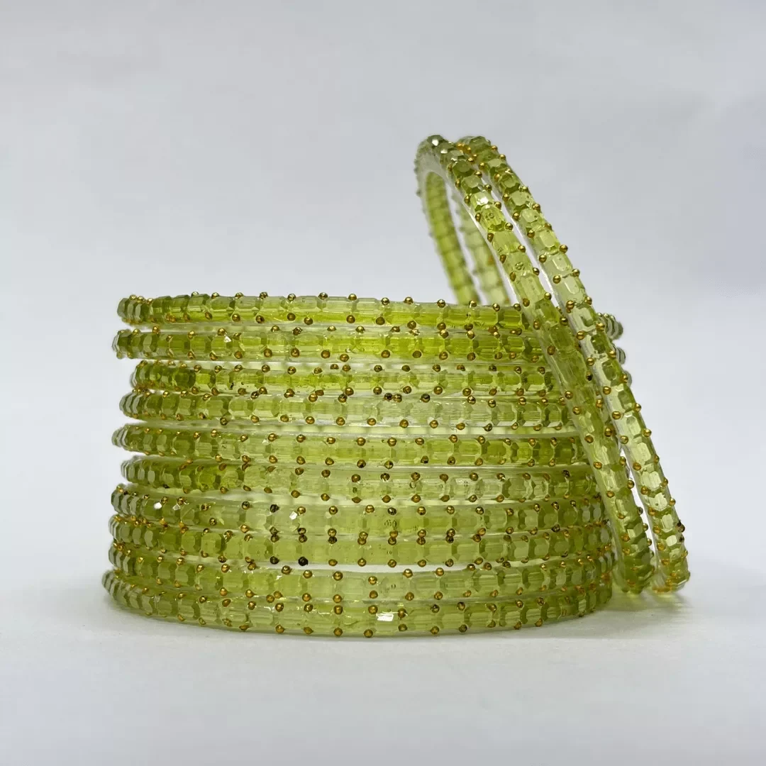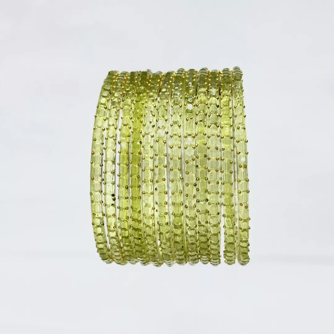 Add a vibrant touch to your ethnic and festive look with this stunning set of pista glass bangles. Crafted from premium-quality transparent glass, each bangle features a beautiful blend of bright hues including pink, yellow, green, and blue, highlighted with delicate golden bead detailing for an elegant finish.