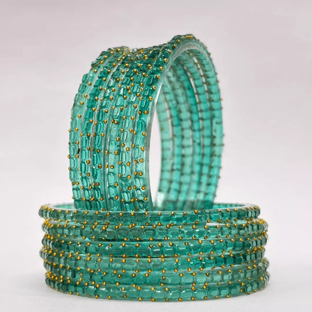 Add a vibrant touch to your ethnic and festive look with this stunning set of sentro glass bangles. Crafted from premium-quality transparent glass, each bangle features a beautiful blend of bright hues including pink, yellow, green, and blue, highlighted with delicate golden bead detailing for an elegant finish.